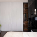In the son’s bedroom, we embraced a bolder, deeper aesthetic. The concrete-paneled wall behind the bed extends to the wardrobe shutters, creating a cohesive, moody atmosphere.