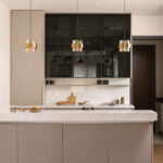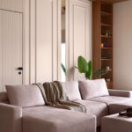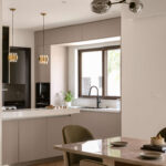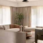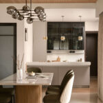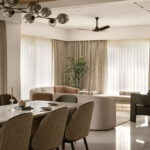 To emphasize fluidity, we used furniture with curved elements and opted for a mid-oak finish on the wood. The flooring features luxurious Italian marble. Without traditional wall partitions, the living, dining, and kitchen areas are interconnected, fostering a sense of unity. The dining area is highlighted by a ceiling treatment, and a neutral palette runs throughout the home, enhancing the seamless and calming atmosphere.