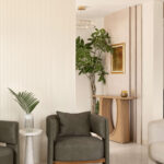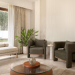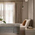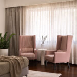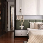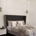 For the master bedroom, we focused on creating a luxurious feel with a double-paneled headboard in two shades of grey, complemented by high-back armchairs. We introduced touches of blush pink to add warmth, while maintaining a clean, geometric, and modern design.