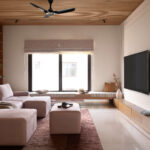 Designed for casual relaxation, the family room includes a bay window and low seating, creating a lounge-like space. The wooden ceiling mirrors the design of the ground floor dining area, connecting the two floors. The seating arrangement allows for various activities—lounging, reading, or sitting on the bay window or floor, promoting a relaxed and versatile environment.