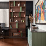 This versatile room serves as both a study and a guest bedroom with a sofa cum bed. We used a beautiful shade of green as an accent against black, with concrete-textured walls to add a moody touch.