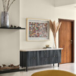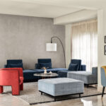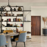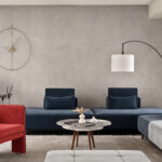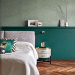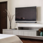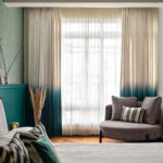 Concrete, upholstery, and wood dominate the living room, while the bedroom embraces dark wood, greys, and green hues. The continuity of color across various materials ties the design elements together seamlessly. The transitional style embraced various elements, including an ombre curtain, which pushed the boundaries of traditional design.