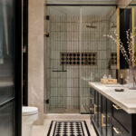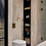 The bathroom stands out as a space of luxury, with black inlay work on marble, complemented by subway tiles in the shower area. A blend of black and brass accents exudes opulence, while hidden storage solutions enhance functionality. The L-shaped walk-in wardrobe is designed for both practicality and aesthetics.
