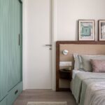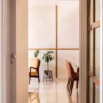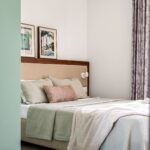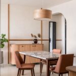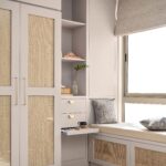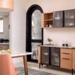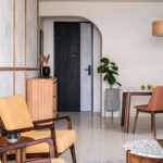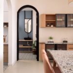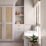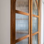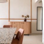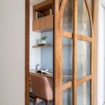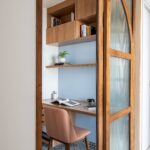 This was originally a laundry room which we converted into a study. We broke the wall and added in an arched sliding door. This gave the space some privacy while the fluted glass still allowed light in. We wanted to brighten up the space as there wasn’t much of an inlet for natural light. To do that, we brightened up the floor with a printed till and continued the shade of blue onto the wall. The natural wood finish continues onto the furniture as it is on the door as well.