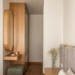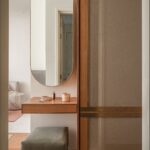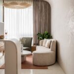 Rather than going the traditional route of using mirrors to open up the space, this approach brings in curves and arches through the ceilings and furniture. The result? A seamless, fluid space that disrupts the rigidity of conventional design. The color palette is dominated by a combination of greys and beiges, with splashes of blush pinks and olive greens. A strange combination at first, but mastered beautifully in this home, capturing the idea of a playful spirit.