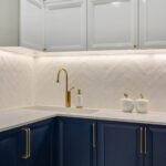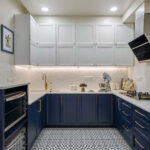 The kitchen was an important room for this couple, with the wife being a baker who worked from home. The room had to be both fun and functional. We carried on the blue theme here, with the lower cabinets painted a deep shade of blue, contrasted by the white ones above. We went with a clean herringbone white subway tile above the counter to break away from the solid color's monotony. We added a pop of print with the tiles on the floor to keep the space light.