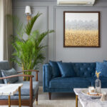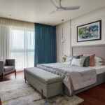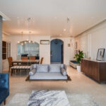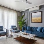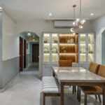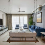 At the entryway, we transformed the cozy foyer with a vibrant splash of color, opting for a refreshing shade of blue to set the tone. Continuing with the blue theme, we picked out a sofa to match. To add in an element of playfulness, we put in a swing at the centre. Designed from scratch, the swing features brass highlights, a wraparound upholstered seat, and a Burma teak base. A discrete minimal modern bar made of wood breaks up the large white wall.